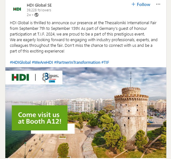 Στη Διεθνή Έκθεση Θεσσαλονίκης, που θα λάβει χώρα από τις 7 έως τις 15 Σεπτεμβρίου, θα συμμετέχει η HDI Global. H παρουσία της θα είναι στο πλαίσιο της επίτιμης συμμετοχής της Γερμανίας στο T.I.F. 2024.