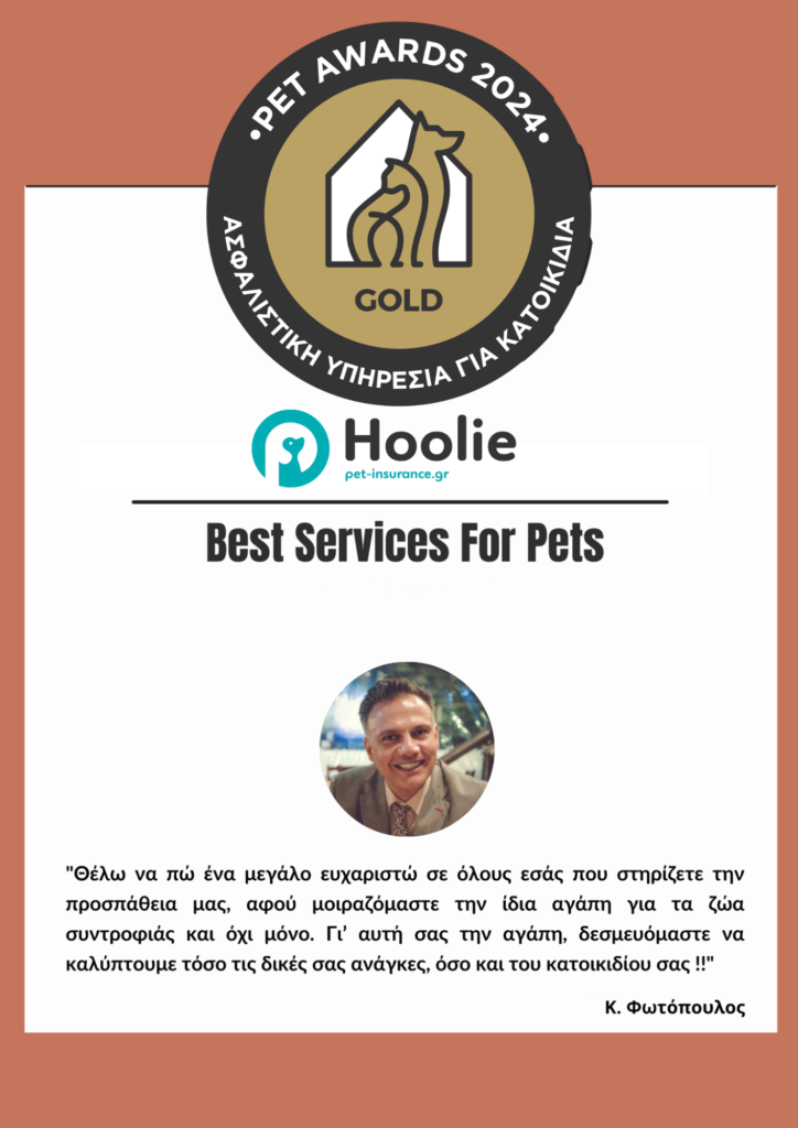 Η ομάδα της Hoolie Foundation με μεγάλη χαρά ανακοινώνει πως συμμετείχε στον διαγωνισμό PET AWARDS 2024, υπό την αιγίδα του Υπουργείου Αγροτικής Ανάπτυξης, και βραβεύτηκε για 4η συνεχόμενη χρονιά στην κατηγορία “Καλύτερη Ασφαλιστική Υπηρεσία για Κατοικίδια” με το GOLD βραβείο της διοργάνωσης!