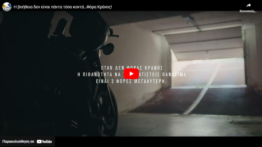 Η νέα εκστρατεία του Ινστιτούτου Οδικής Ασφάλειας (ΙΟΑΣ) «Πάνος Μυλωνάς», σε συνεργασία με το Eθνικό Κέντρο Άμεσης Βοήθειας (ΕKAB), απευθύνεται στους μοτοσυκλετιστές και αφορά στην αναγκαιότητα χρήσης κράνους, με κεντρικό μήνυμα “Η βοήθεια δεν είναι πάντα τόσο κοντά…Φόρα Κράνος”. Η καμπάνια αποτελείται από ένα video που μας υπενθυμίζει ότι ο καλύτερος τρόπος να προστατεύσεις τον εαυτό σου όταν ανεβαίνεις σε μηχανή είτε ως οδηγός είτε ως επιβάτης είναι να φοράς κράνος.