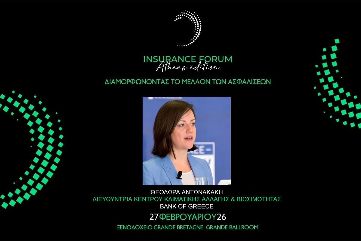 Στο Athens Insurance Forum που πραγματοποιείται 27 Φλεβάρη στο ξενοδοχείο Grand Bretagne θα μιλήσει η κα. Θεοδώρα Αντωνακάκη, Διευθύντρια του Κέντρου Κλιματικής Αλλαγής και Βιωσιμότητας της Τράπεζας της Ελλάδος.