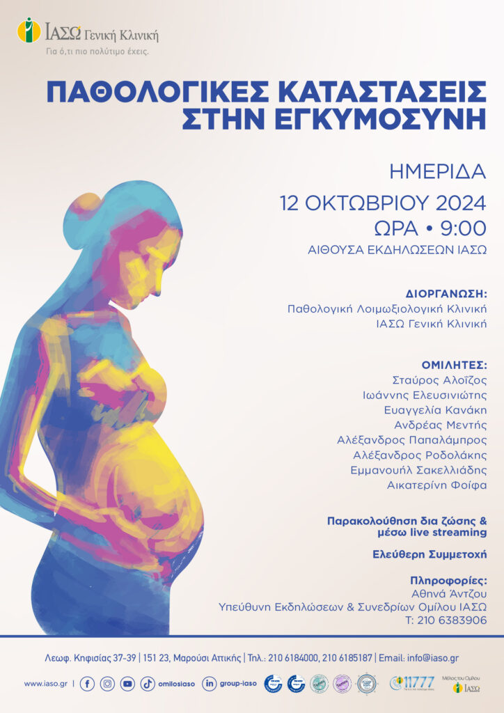 Το ΙΑΣΩ Γενική Κλινική σε συνεργασία με τη Παθολογική Λοιμωξιολογική Κλινική διοργανώνει Ημερίδα με θέμα «Παθολογικές Καταστάσεις στην Εγκυμοσύνη», η οποία θα πραγματοποιηθεί το Σάββατο 12 Οκτωβρίου 2024, ώρα 09:00, στην Αίθουσα Εκδηλώσεων του ΙΑΣΩ (Λεωφ. Κηφισίας 37-39, Μαρούσι).