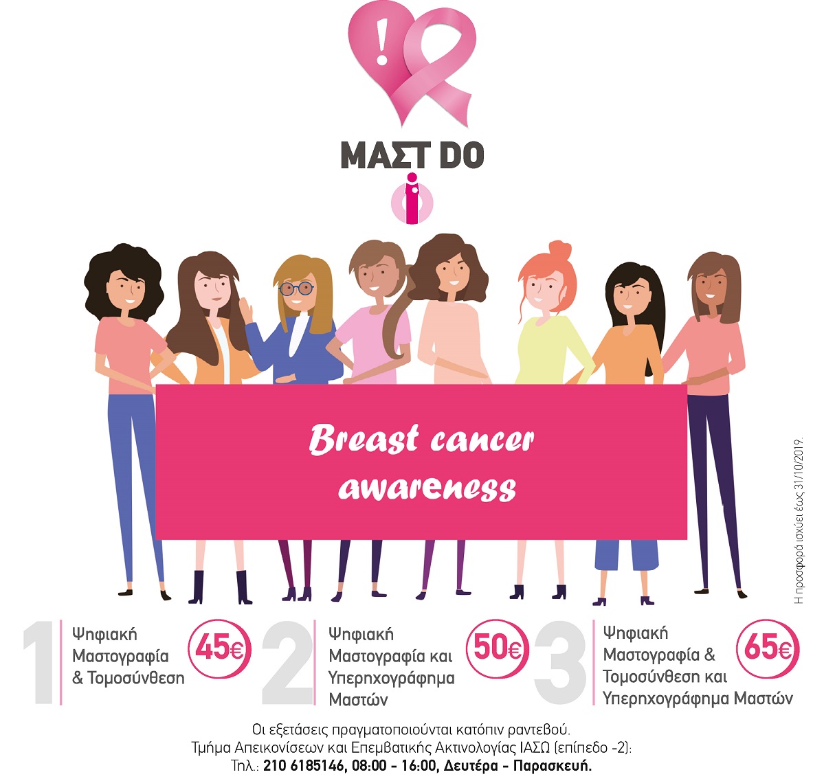 Στο πλαίσιο της ΜΑΣΤ-DO καμπάνιας που στόχο έχει να ευαισθητοποιήσει τις γυναίκες, προσφέρονται τρεις επιλογές για τον έλεγχο του μαστού σε προνομιακή τιμή.