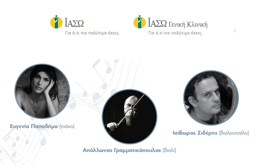 Η διακεκριμένη σολίστ πιάνου κα. Ευγενία Παπαδήμα μαζί με τον κ. Απόλλωνα Γραμματικόπουλο, βιολονίστα, Κορυφαίο Α’ της Κρατικής Ορχήστρας Αθηνών και τον κ. Ισίδωρο Σιδέρη, Κορυφαίο βιολοντσελίστα της Κρατικής Ορχήστρας Αθηνών, θα μας ταξιδέψουν στις μουσικές διεθνώς αναγνωρισμένων συνθετών της κλασικής μουσικής όπως J. Halvorsen, J.S. Bach, S. Rachmaninoff και A. Piazzola. Τα έργα των μεγάλων συνθετών θα ζωντανέψουν από τα μαγικά δάχτυλα της κας. Ευγενίας Παπαδήμα και οι νότες θα γεμίσουν τον προαύλιο χώρο του νοσοκομείου μας.