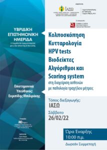 Το Τμήμα Κολποσκόπησης και Παθολογίας Τραχήλου Μήτρας του ΙΑΣΩ σε συνεργασία με την Ελληνική Εταιρεία Κολποσκόπησης και Παθολογίας Τραχήλου (HSCCP), διοργανώνει την Υβριδική Επιστημονική Ημερίδα με θέμα “Κολποσκόπηση, Κυτταρολογία, HPV tests, Βιοδείκτες, Αλγόριθμοι και Scoring system στη διαχείριση ασθενών με παθολογία τραχήλου μήτρας”, το Σάββατο 26 Φεβρουαρίου 2022, ώρα 10:00 π.μ., στην Αίθουσα Εκδηλώσεων του ΙΑΣΩ.