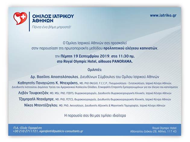Πρωτοποριακή μέθοδος προληπτικού ελέγχου καπνιστών θα παρουσιάσει σε συνέντευξη τύπου ο Όμιλος Ιατρικού Αθηνών την Πέμπτη 19 Σεπτεμβρίου 2019 στο Royal Olympic.