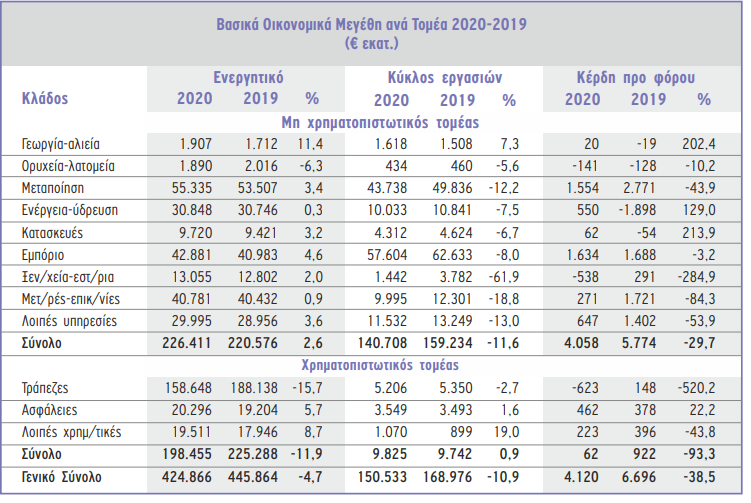 Σαφώς, οι συνθήκες πανδημίας και τα περιοριστικά μέτρα που ελήφθησαν για την αντιμετώπισή της, επηρέασαν αρνητικά το σύνολο του ελληνικού εταιρικού τομέα. Ωστόσο, διαφορετικές ήταν οι επιπτώσεις για τους επιμέρους επιχειρηματικούς τομείς. Υπάρχουν κλάδοι που κατέγραψαν σημαντικές απώλειες, αλλά και κλάδοι οι οποίοι επέδειξαν ανθεκτικότητα ή επηρεάστηκαν σε πολύ χαμηλό βαθμό. Σε γενικές γραμμές διαπιστώνεται ότι, παρά τη μείωση των πωλήσεων οι εταιρείες κατάφεραν να περιορίσουν τα λειτουργικά τους έξοδα και να διαχειριστούν καλύτερα τα κόστη τους, με αποτέλεσμα να διατηρήσουν ή να αυξήσουν, έστω και οριακά, τα περιθώρια κερδοφορίας. Επιπλέον, βελτιώθηκαν και οι μέσοι δείκτες αποδοτικότητας ιδίων και απασχολουμένων κεφαλαίων των συγκεκριμένων κλάδων.”