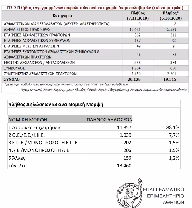 Βάσει των στοιχείων που ανακοινώθηκαν στη σχετική παρουσίαση οι ασφαλιστικοί διαμεσολαβητές στην Ελλάδα ανέρχονται περίπου στις 13.000 με το περίπου 49,3% του Κλάδου να δηλώνει ετησίως ακαθάριστα έσοδα έως 15.000 ευρώ και το 23,6% από 15.000 έως 30.000 ευρώ.