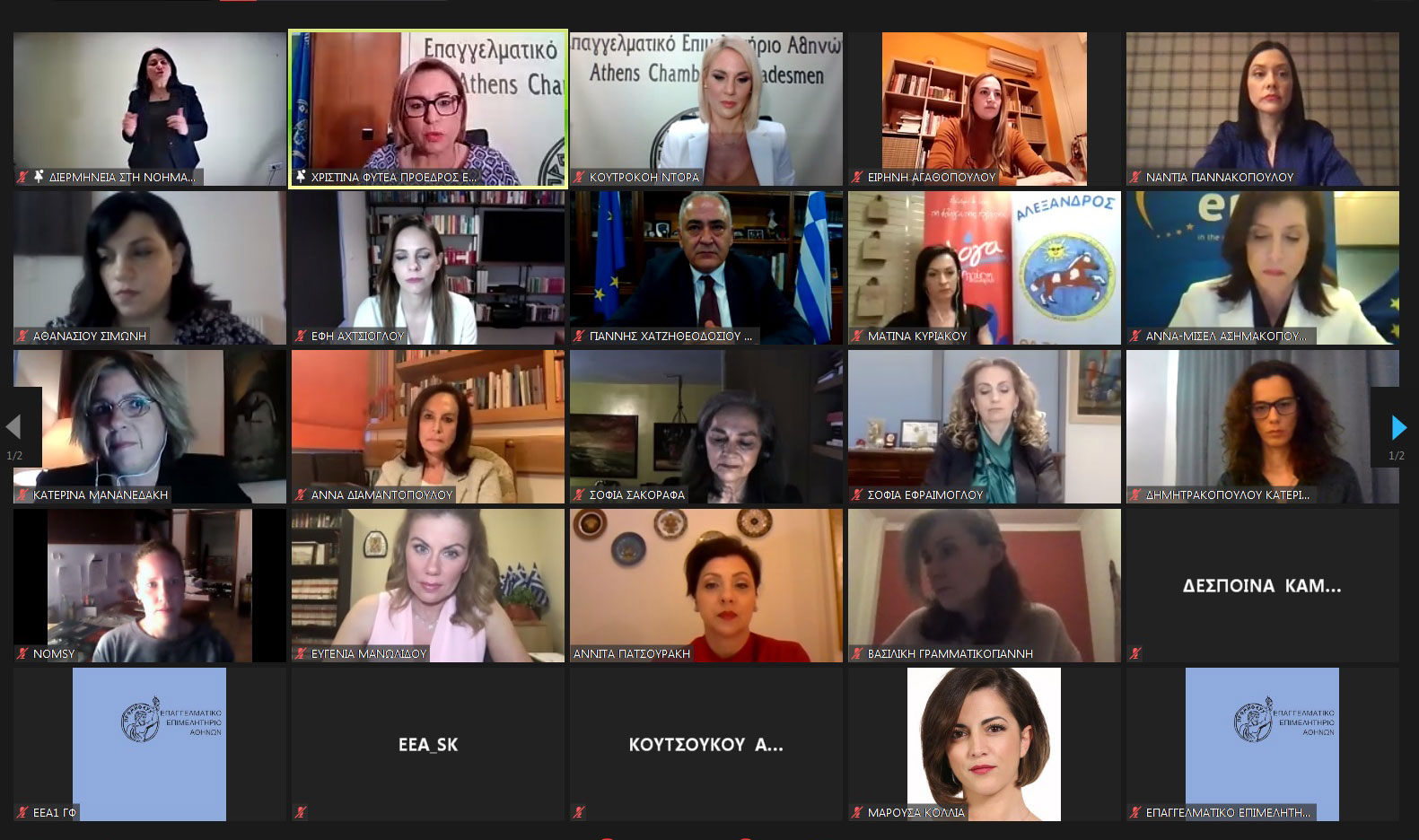 Με μεγάλη επιτυχία και ουσιαστικά μηνύματα καταξιωμένων γυναικών από τους χώρους της πολιτικής, των επιμελητηρίων, του επιχειρείν, της επιστήμης και του πολιτισμού, αλλά και τον κοινωνικό στίβο, πραγματοποιήθηκε, την Δευτέρα 8 Μαρτίου 2021, η διαδικτυακή εκδήλωση του Επαγγελματικού Επιμελητηρίου Αθηνών και της Επιτροπής Γυναικείας Επιχειρηματικότητας του Ε.Ε.Α. με αφορμή την Παγκόσμια Ημέρα της Γυναίκας.