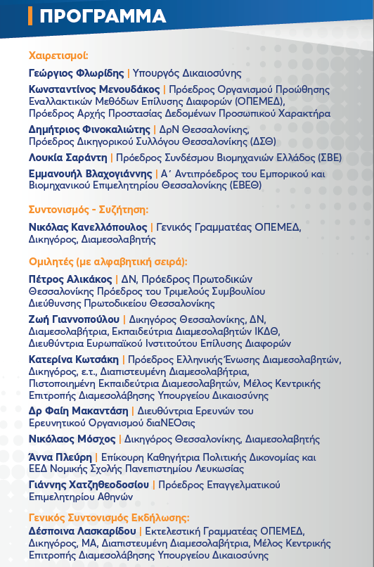 Ειδική εκδήλωση για την «Ημέρα της Διαμεσολάβησης» διοργανώνουν την Τετάρτη, 20 Μαρτίου 2024, ώρα 18:00 στην αίθουσα εκδηλώσεων του Εμπορικού & Βιομηχανικού Επιμελητηρίου Θεσσαλονίκης οι Οργανισμός Προώθησης Εναλλακτικών Μεθόδων Επίλυσης Διαφορών (ΟΠΕΜΕΔ), Δικηγορικός Σύλλογος Θεσσαλονίκης (ΔΣΘ) Ο Σύνδεσμος Βιομηχανιών Ελλάδος (ΣΒΕ) και το Εμπορικό και Βιομηχανικό Επιμελητήριο Θεσσαλονίκης (ΕΒΕΘ).