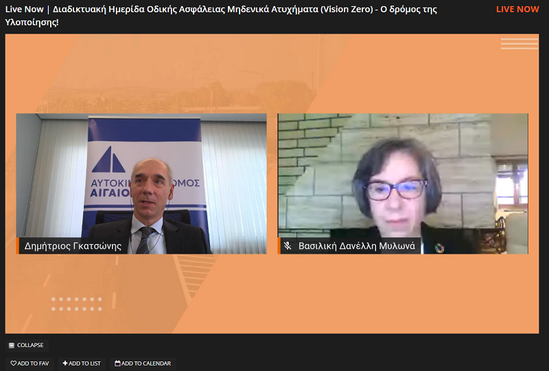 Με εξαιρετικά ενδιαφέρουσες παρουσιάσεις και τοποθετήσεις στο ζήτημα της Οδικής Ασφάλειας και του οδικού χάρτη προς τον στόχο «VisionZero – Μηδενικά Ατυχήματα» πραγματοποιήθηκε τη Δευτέρα 9 Νοεμβρίου η διαδικτυακή ημερίδα «Μηδενικά ατυχήματα: Ο δρόμος της υλοποίησης» από την Αυτοκινητόδρομος Αιγαίου, σε συνεργασία με το Ινστιτούτο Οδικής Ασφάλειας «Πάνος Μυλωνάς» ΙΟΑΣ.