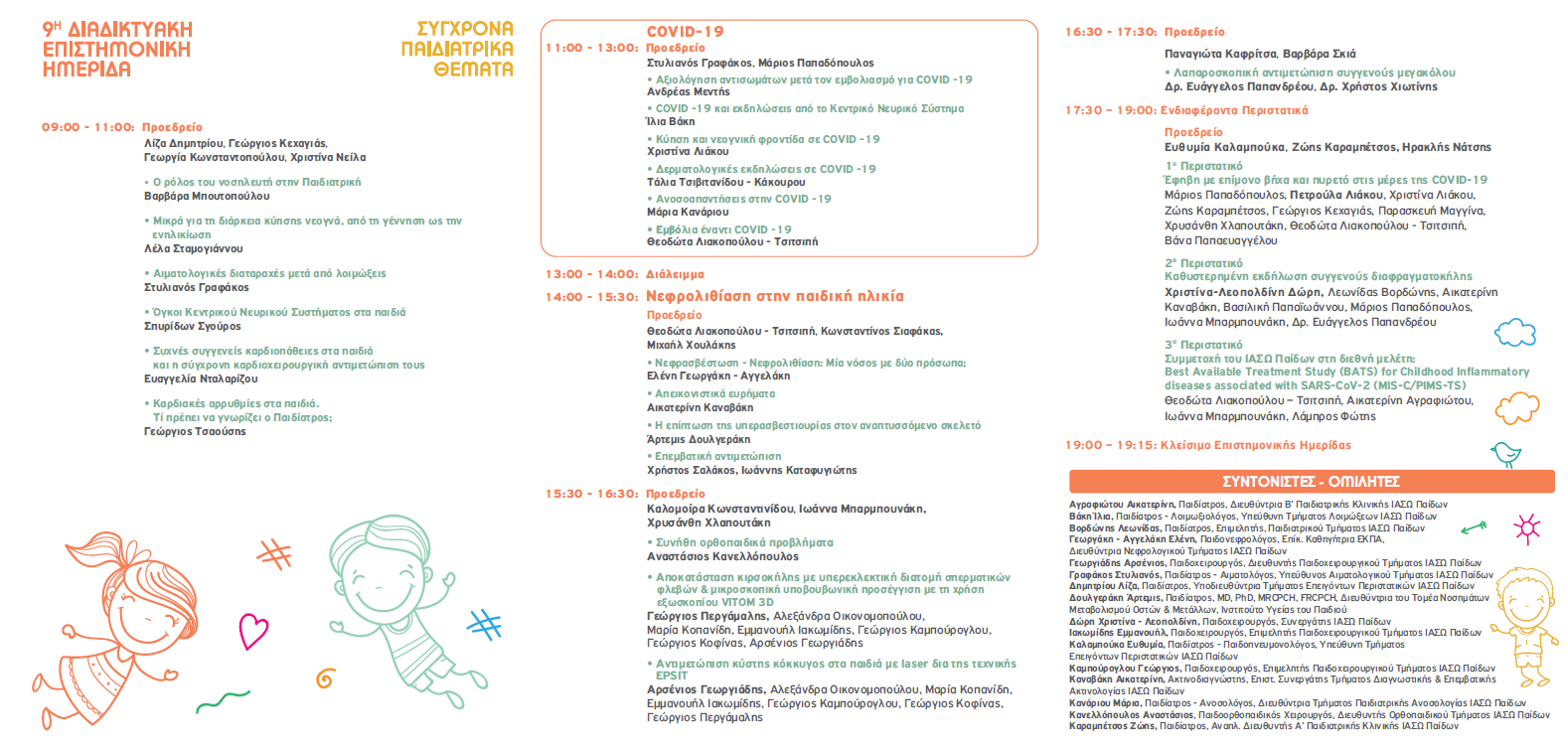 Στη συνέχεια, οι ομιλητές θα παρουσιάσουν επιπλέον ενδιαφέροντα σοβαρά παιδιατρικά περιστατικά στην “COVID-19” και τη “Συγγενή Διαφραγματοκήλη”. Στο κλείσιμο της ημερίδας, θα γίνει ειδική αναφορά της συμμετοχής του ΙΑΣΩ Παίδων στη διεθνή μελέτη “Best Available Treatment Study (BATS) for Childhood Inflammatory diseases associated with SARS-CoV-2 (MIS-C/PIMS-TS)”.