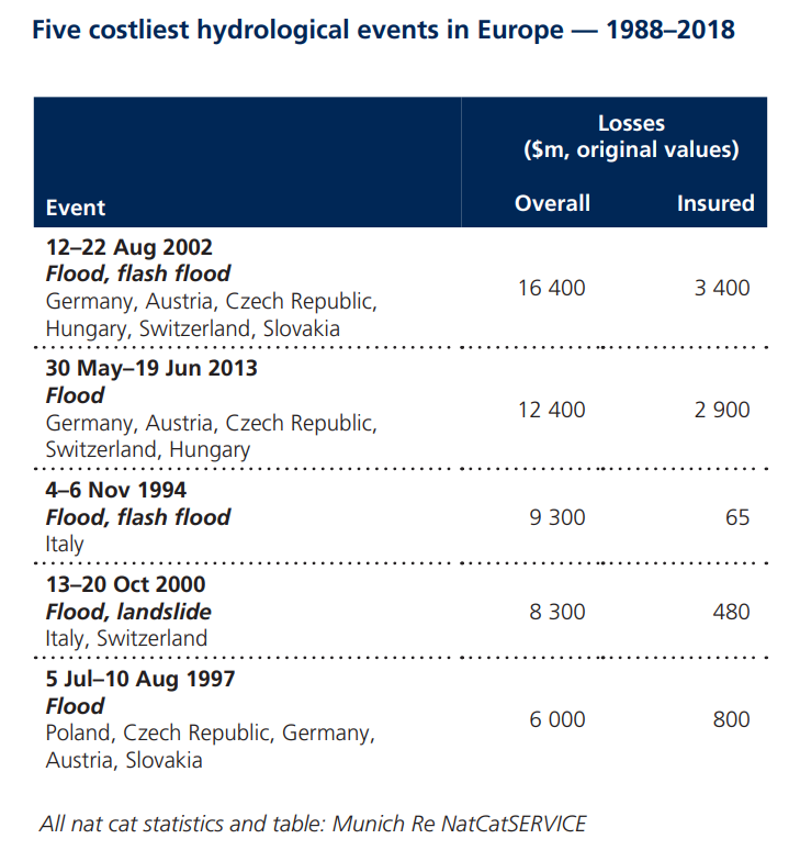 Την ερχόμενη δεκαετία στην Ευρώπη αναμένεται να υπάρξει μεγαλύτερο κενό ανάμεσα στις συνολικές απώλειες από πλημμύρες και στις απώλειες που ασφαλίζονται και μπορούν να ασφαλιστούν. Από το 1988 έως το 2018 μόνο το 27% των ζημιών από πλημμύρες ήταν ασφαλισμένο και αυτό το ποσοστό διέφερε σημαντικά μεταξύ των κρατών.