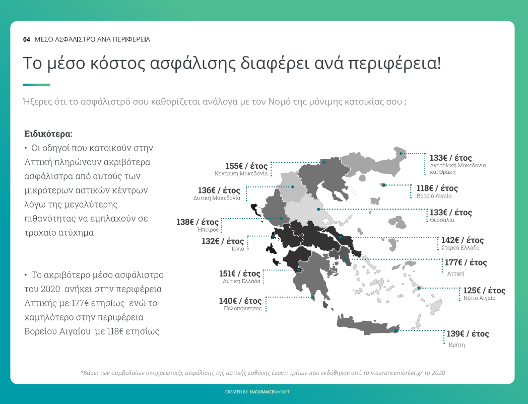 Τα ακριβότερα ασφάλιστρα κατά μέσο όρο είναι στην Αττική και φτάνουν τα 177€ ετησίως. Αντίθετα, τα πιο οικονομικά ασφάλιστρα φαίνεται να τα έχει το Βόρειο Αιγαίο με 118€ ετησίως.