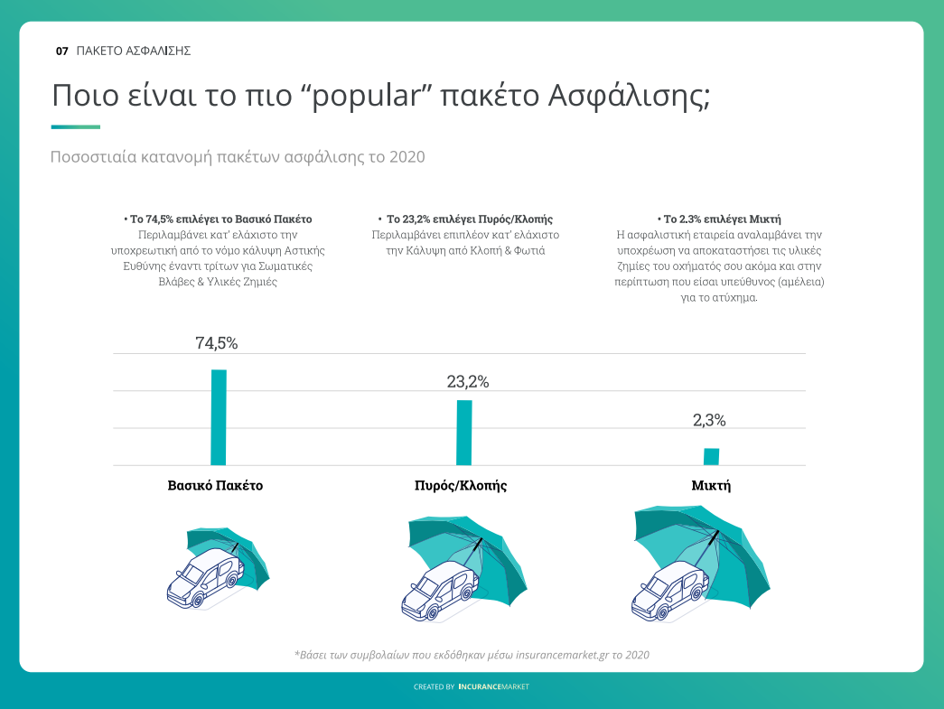 Η απόρροια αυτή αποδίδεται στις μειώσεις τιμών που έκαναν οι ασφαλιστικές λόγω των επιπτώσεων της πανδημίας στα εισοδήματα των πολιτών αλλά και της περιορισμένης κυκλοφορίας των οχημάτων. Περίπου 6 στους 10 έχουν αυτοκίνητα 9-11 ίππων και 5 στους 10 μηχανές κάτω των 250 κυβικών.
