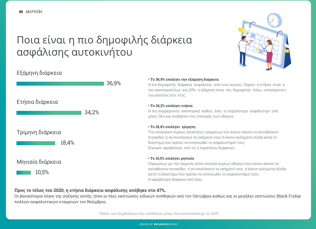 Μεγάλη αύξηση καταγράφεται στα ετήσια συμβόλαια ασφάλισης που από το 33% το 2019, προς το τέλος του 2020 έφτασαν στο 47%. «Βασικός λόγος της αύξησης αυτής» εξηγούν οι αναλυτές «είναι οι πολύ ελκυστικές εκπτώσεις του Νοεμβρίου αλλά και η δυνατότητα των έως 12 άτοκων δόσεων που προστέθηκε στην πλατφόρμα τον Δεκέμβριο».