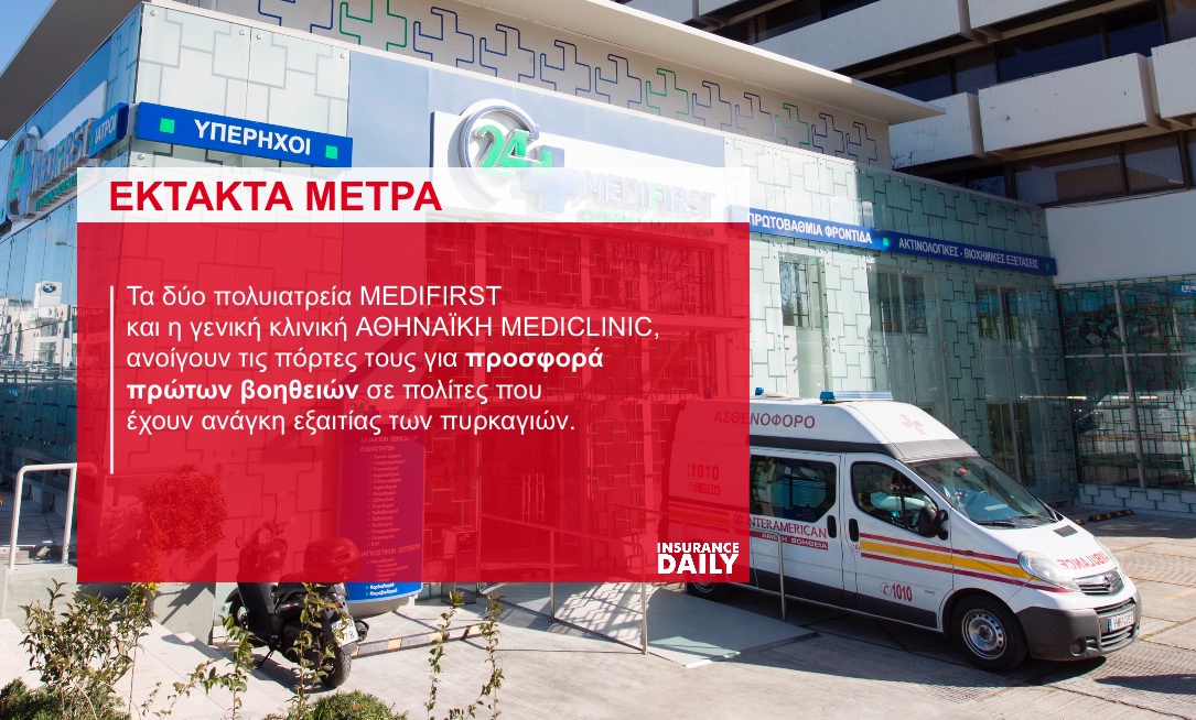 Τόσο τα δύο πολυιατρεία MEDIFIRST, στον Παράδεισο Αμαρουσίου και στην Αργυρούπολη όσο και η γενική κλινική ΑΘΗΝΑΪΚΗ MEDICLINIC, ανοίγουν τις πόρτες τους για προσφορά πρώτων βοηθειών σε πολίτες που έχουν ανάγκη εξαιτίας των πυρκαγιών στις περιοχές που πλήττονται: για εγκαύματα, αναπνευστικά ή άλλα προβλήματα.