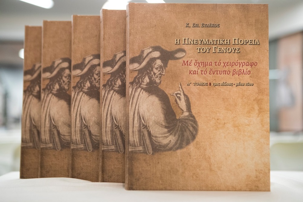 Η εξαιρετική εργασία του Κωνσταντίνου Σπ. Στάικου για την «Πνευματική Πορεία του Γένους με όχημα το χειρόγραφο και το έντυπο βιβλίο», της οποίας ο πρώτος τόμος εκδόθηκε και κυκλοφόρησε πρόσφατα με την αποκλειστική χορηγική υποστήριξη της INTERAMERICAN, παρουσιάστηκε στις 26 Φεβρουαρίου και στα Ιωάννινα, στο πρόγραμμα των παράλληλων πολιτιστικών εκδηλώσεων με αφορμή την επέτειο απελευθέρωσης της πόλης. Την εκδήλωση οργάνωσε το Ίδρυμα Μελετών Ιονίου και Αδριατικού Χώρου στο Μέγαρο της Ε.Η.Μ., με ομιλητή τον Κωνσταντίνο Θ. Πέτσιο, καθηγητή Φιλοσοφίας του Πανεπιστημίου Ιωαννίνων και με θέμα «Πνευματικές διοδεύσεις από τα μέσα του 13ου αι. έως τα μέσα του 16ου αι., με σηματωρούς ελληνικά χειρόγραφα και παλαίτυπα». Στο πλαίσιο της παρουσίασης του βιβλίου, εκτέθηκαν σπάνιες εκδόσεις της περιόδου της Ιταλικής Αναγέννησης.