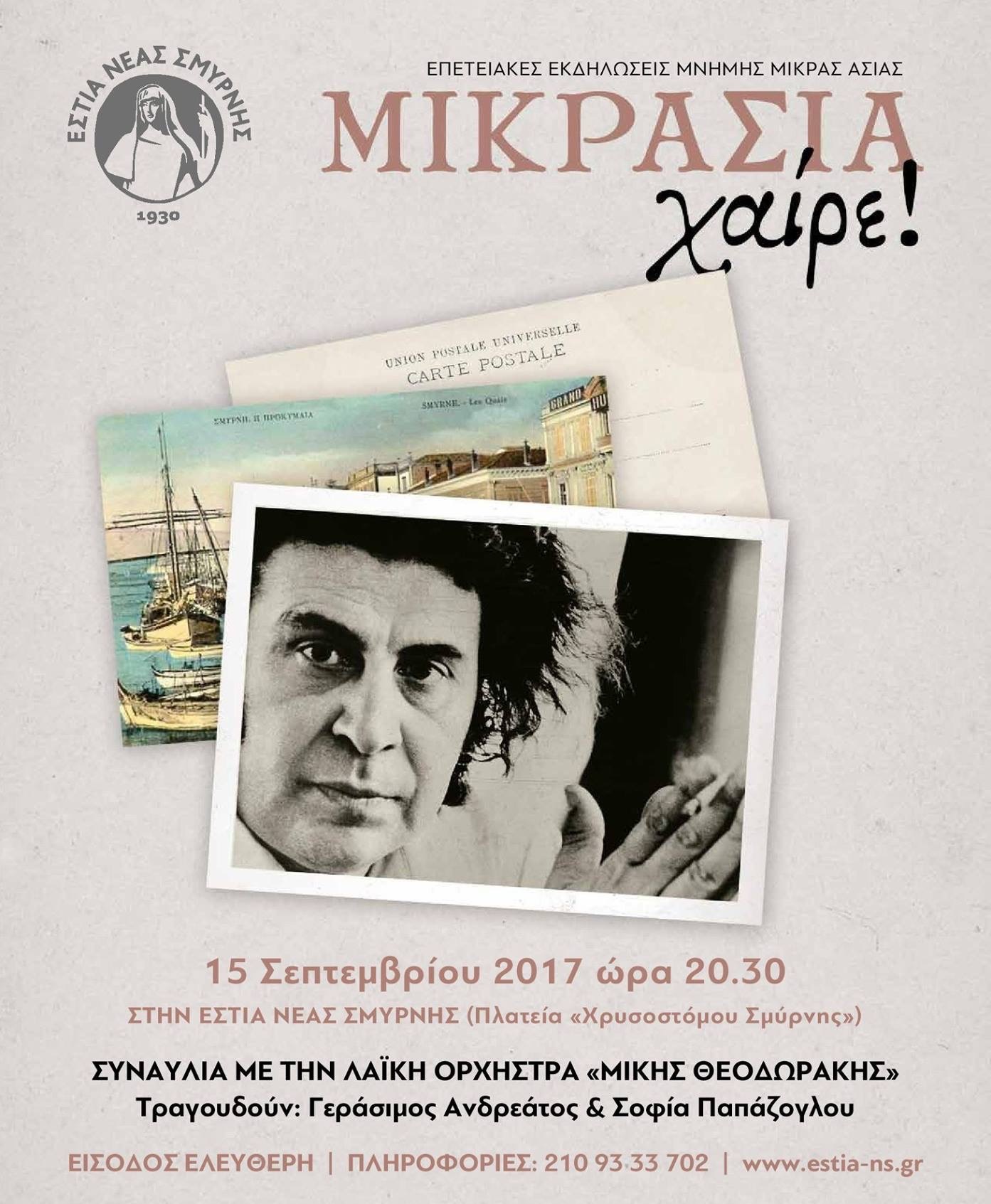 Με τη συναυλία, θα τιμηθεί ο μικρασιατικής καταγωγής Μίκης Θεοδωράκης, που στις 29 Ιουλίου συμπλήρωσε τα 92 χρόνια του – γεννήθηκε το 1925 στη Χίο. Με τη μητέρα του να έχει γεννηθεί στον Τσεσμέ -την πάλαι ποτέ Κρήνη- και τους γονείς της συζύγου του στη Σμύρνη, η περιοχή της Νέας Σμύρνης στην Αθήνα αποτέλεσε τον φυσικό προορισμό της οικογένειας και το σπίτι του Μίκη στη Νέα Σμύρνη έγινε ορμητήριο και καταφύγιο συνάμα για τον ίδιο και την οικογένειά του, κατά τα δύσκολα χρόνια ενδιάμεσα στην εξορία.