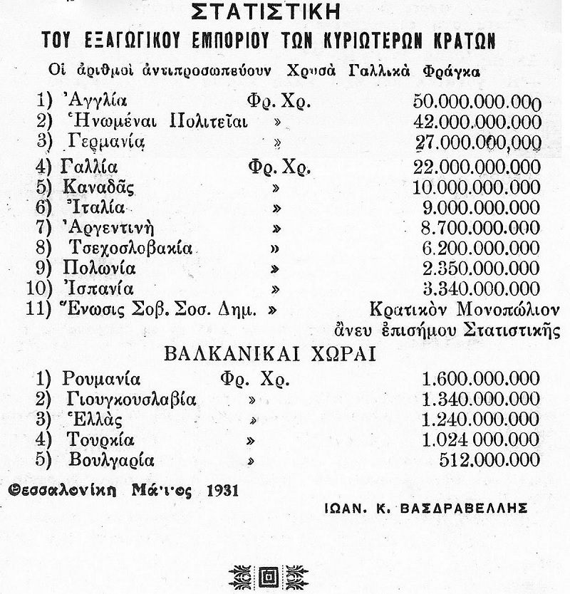 Ώστε, λοιπόν, σε χρυσά Γαλλικά Φράγκα μετρούσαν τότε και μετά τον Πόλεμο και την Πανδημία Γρίπης το Εξαγωγικό Εμπόριο; Και ώστε η Αγγλία πρωταγωνιστούσε Παγκοσμίως και «καπέλωνε» και τις ΗΠΑ και την Γερμανία και την Γαλλία και όλες τις άλλες χώρες, με μη γνωστό εξαγωγικό Εμπόριο της Ρωσίας και ανύπαρκτο της Κίνας, με την μικρή Ελλάδα να ξεπερνάει τον Μεγάλο Τουρκο-Μπουνταλά; Φρικτά-φρικτά και άρα: Ξανά Πολέμους και ξανά «ιούς» για ανακατανομή και αναδιανομή του πλούτου επί γης. Ας τα δούμε στην πράξη και αυτά: