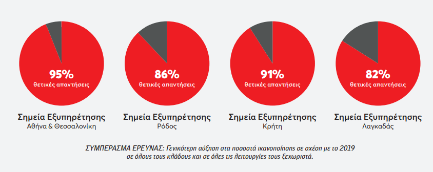 Ο Γενικός Βαθμός Ικανοποίησης ως προς τα Σημεία Εξυπηρέτησης είναι ανοδικός. Στην Αθήνα και τη Θεσσαλονίκη σημειώνονται τα υψηλότερα ποσοστά θετικών απαντήσεων (95%), ενώ στη Ρόδο, το Ηράκλειο και το Λαγκαδά τα ποσοστά παραμένουν αρκετά ψηλά, 86%, 91% και 82% αντίστοιχα.