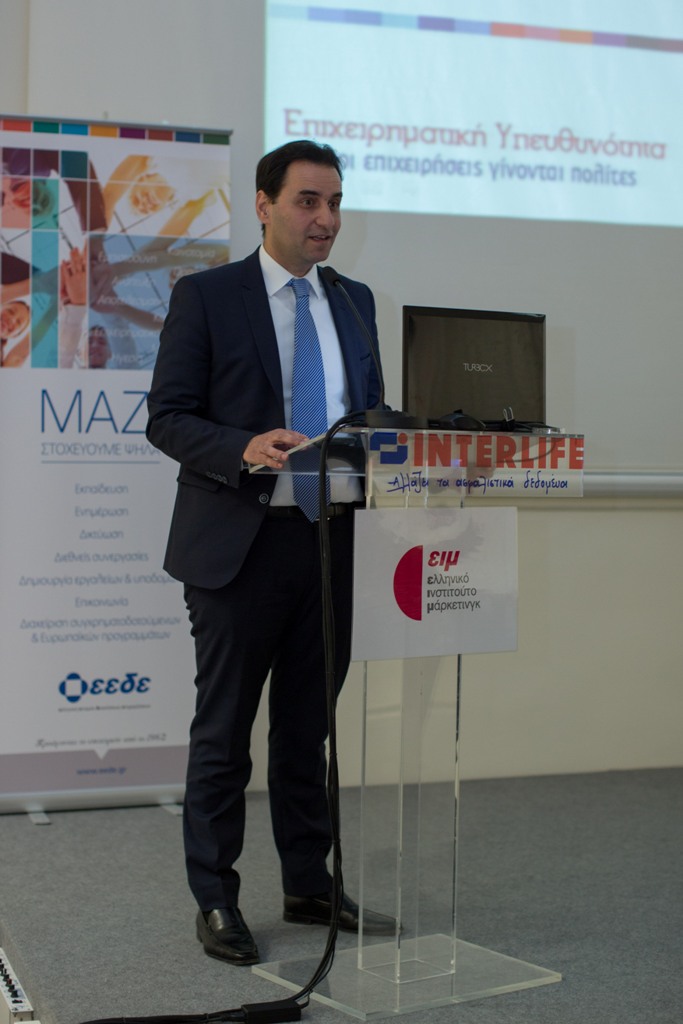 Με στόχο να παρουσιαστούν οι βέλτιστες πρακτικές που εφαρμόζονται στον τομέα της Εταιρικής Υπευθυνότητας (ΕΚΕ), το Ελληνικό Ινστιτούτο Μάρκετινγκ (ΕΙΜ) του Τμήματος Μακεδονίας της ΕΕΔΕ οργάνωσε Ημερίδα με θέμα: «Υπεύθυνο Επιχειρείν στην Πράξη» στο Αμφιθέατρο της INTERLIFE Ασφαλιστικής στη Θεσσαλονίκη, με τη συμμετοχή Μελών του Ινστιτούτου και Στελεχών Επιχειρήσεων.