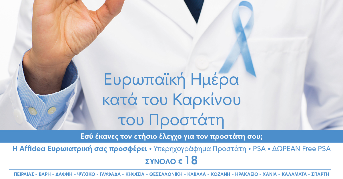 Η Αffidea Ευρωιατρική, επιθυμώντας να συμβάλει στην προαγωγή υγείας του ανδρικού πληθυσμού, σε μια δύσκολη οικονομική συγκυρία, προσφέρει μέχρι το τέλος Οκτωβρίου ολοκληρωμένο πακέτο προληπτικού ελέγχου του προστάτη.