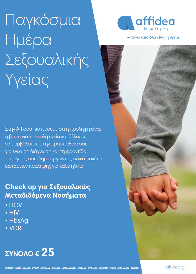 Αυτό είναι το μήνυμα της νέας καμπάνιας της Affidea για τα σεξουαλικώς μεταδιδόμενα νοσήματα, η οποία σχεδιάστηκε με αφορμή την Παγκόσμια Ημέρα Σεξουαλικής Υγείας. Η προωθητική αυτή ενέργεια στόχο έχει να συμβάλει μέσα από τη γνώση και την εξέταση, μικροί και μεγάλοι να αισθάνονται πιο σίγουροι, να νιώθουν πιο δυνατοί και να έχουν μεγαλύτερη αυτοπεποίθηση στη σεξουαλική τους ζωή. Στην Ελλάδα υπολογίζεται πως περίπου το 23% των ανθρώπων που ζουν με HIV και το 80% αυτών που ζουν με ηπατίτιδα C, δεν γνωρίζει ότι έχει εκτεθεί στους ιούς.