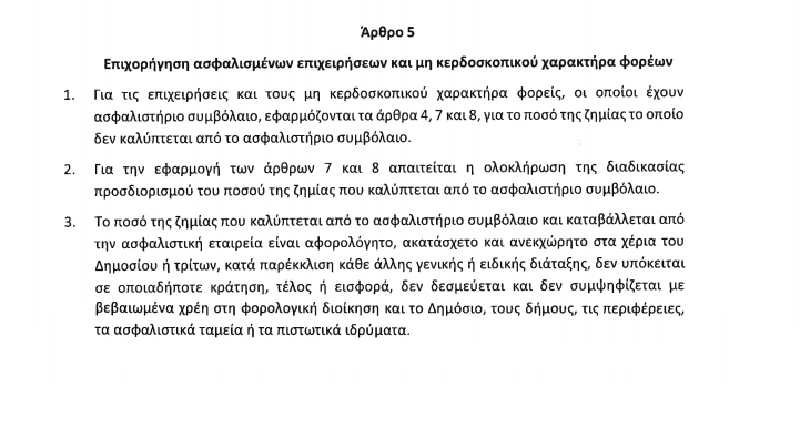 Για το εν λόγω νομοσχέδιο “Κρατική αρωγή προς επιχειρήσεις και μη κερδοσκοπικού χαρακτήρα φορείς για θεομηνίες, επείγουσες ρυθμίσεις για τη στήριξη της οικονομίας, συμπληρωματικός κρατικός προϋπολογισμός και συνταξιοδοτική ρύθμιση” η ασφαλιστική αγορά είχε εκφράσει εξαρχής την αντίθεσή της, επισημαίνοντας ότι θα λειτουργήσει σαν αντικίνητρο για την ιδιωτική ασφάλιση, χωρίς ταυτόχρονα να επιλύει το σημαντικό ζήτημα της εξεύρεσης πόρων για την κάλυψη των ζημιών .