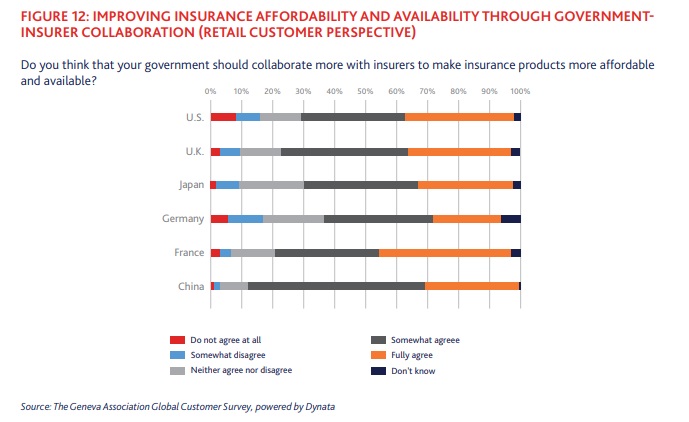 Ταυτόχρονα η πλειοψηφία των ερωτηθέντων συμφωνεί ότι οι κυβερνήσεις θα πρέπει να συνεργαστούν με την ασφαλιστική αγορά προκειμένου τα προγράμματα να καταστούν πιο προσιτά και διαθέσιμα. Τα μεγαλύτερα εν προκειμένω ποσοστά καταγράφονται σε Κίνα, Γαλλία και Ηνωμένο Βασίλειο.