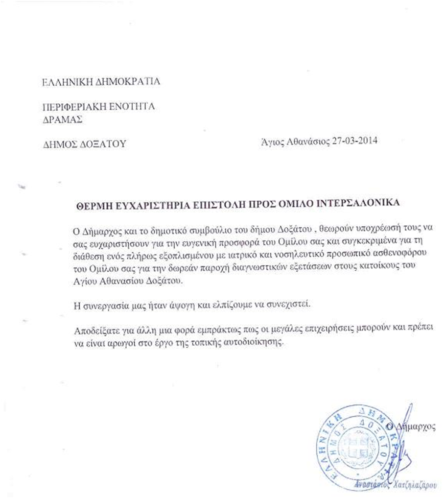 Σε συνέχεια της προσπάθειας αυτής λάβαμε την ευχαριστήρια επιστολή του Δήμου Δοξάτου ως απόδειξη της παρουσίας μας με ειδικευμένο ιατρικό προσωπικό και ασθενοφόρο του Ομίλου «ΙΝΤΕΡΣΑΛΟΝΙΚΑ».
