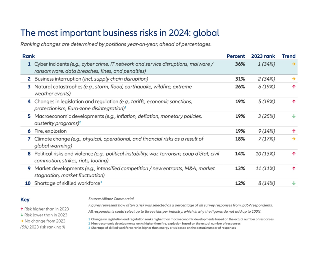 Σύμφωνα με την έκθεση Allianz Risk Barometer, τα περιστατικά κυβερνοασφάλειας, όπως οι επιθέσεις με ransomware, οι παραβιάσεις δεδομένων και οι διαταραχές στον τομέα της πληροφορικής, αποτελούν τον μεγαλύτερο προβληματισμό για τις εταιρίες παγκοσμίως το 2024. Ο στενά συνδεδεμένος κίνδυνος της Διακοπής εργασιών βρίσκεται στη δεύτερη θέση.