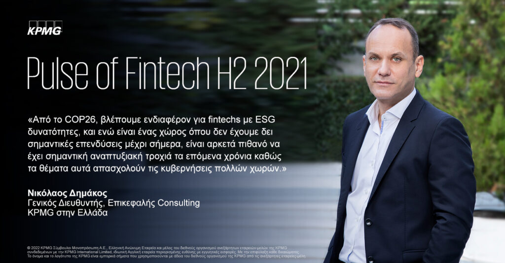 Ο Νίκος Δημάκος, Γενικός Διευθυντής, Επικεφαλής Consulting, KPMG στην Ελλάδα, δήλωσε σχετικά «Από το COP26, βλέπουμε ενδιαφέρον για fintechs με ESG δυνατότητες, και ενώ είναι ένας χώρος όπου δεν έχουμε δει σημαντικές επενδύσεις μέχρι σήμερα, είναι αρκετά πιθανό να έχει σημαντική αναπτυξιακή τροχιά τα επόμενα χρόνια καθώς τα θέματα αυτά απασχολούν τις κυβερνήσεις πολλών χωρών.»
