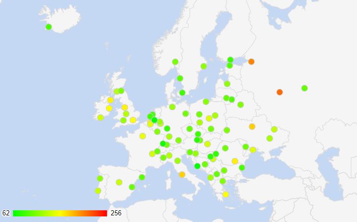 Στον παρακάτω χάρτη απεικονίζεται ο δείκτης κυκλοφοριακής συμφόρησης σε διάφορες πόλεις της Ευρώπης.