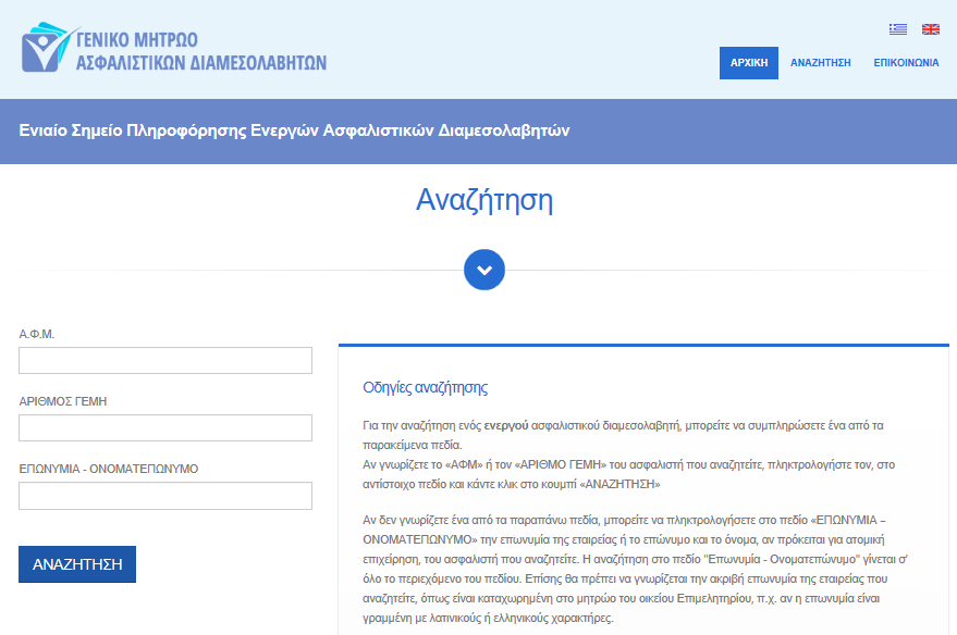 Ο χρήστης πρέπει να συμπληρώσει τα πεδία «ΑΦΜ» ή τον «ΑΡΙΘΜΟ ΓΕΜΗ» του ασφαλιστή που αναζητεί εφόσον τα γνωρίζει και να κάνει κλικ στο κουμπί «ΑΝΑΖΗΤΗΣΗ». Στην περίπτωση που δεν γνωρίζει ωστόσο τα δεδομένα αυτά μπορεί να πληκτρολογήσει μόνο στο πεδίο «ΕΠΩΝΥΜΙΑ – ΟΝΟΜΑΤΕΠΩΝΥΜΟ» την επωνυμία της εταιρείας ή το επώνυμο και το όνομα, αν πρόκειται για ατομική επιχείρηση, του ασφαλιστή που αναζητεί.