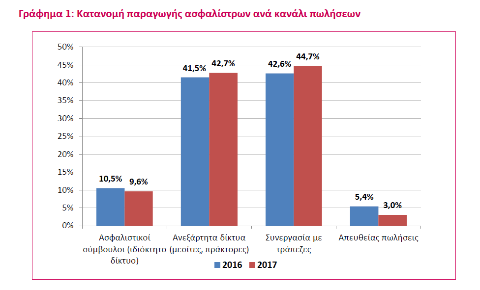 Σύμφωνα με έρευνα της ΕΑΕΕ τα δύο κανάλια διανομής κυριαρχούν στον κλάδο με τις τράπεζες να έχουν το 2017 το 44,7% επί του συνόλου, τα ανεξάρτητα δίκτυα (μεσίτες, πράκτορες) να συμμετέχουν κατά 42,7%, οι ασφαλιστικοί σύμβουλοι με (ιδιόκτητο δίκτυο) 9,6%, και οι απευθείας πωλήσεις με 3%.