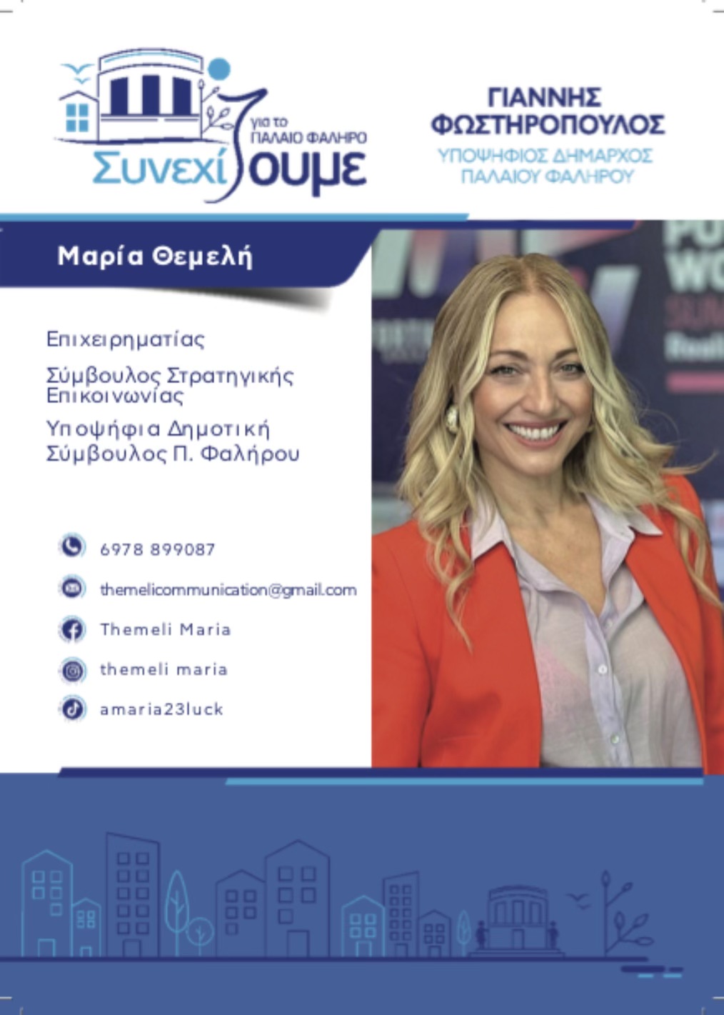 Υποψήφια δημοτική σύμβουλος με το ψηφοδέλτιο του Γιάννη Φωστηρόπουλου στο Παλαιό Φάληρο (συνδυασμός «ΣυνεχίΖουμε για το Παλαιό Φάληρο») κατεβαίνει η Μαρία Θεμελή, η οποία τα τελευταία χρόνια δραστηριοποιείται στο τομέα της συμβουλευτικής έχοντας ανοίξει τη δική της εταιρεία στρατηγικής επικοινωνίας.