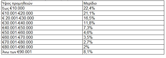 Το ύψος των προμηθειών: Το 22,4% έχει προμήθειες έως 10.000 ευρώ, ενώ το 8,1% παίρνει πάνω από 90.001 ευρώ. Συνολικά 6 στους 10 διαμεσολαβητές εισπράττουν κάθε χρόνο προμήθειες έως 30.000 ευρώ. Αθροίζοντας τα έσοδα ανά κατηγορία διαμεσολάβησης βλέπουμε ότι τα υψηλότερα μικτά έσοδα προμηθειών, που ανέρχονται σε 232,6 εκατ. ευρώ, τα έχουν οι μεσίτες με επαγγελματική εγκατάσταση, ενώ οι πράκτορες που αριθμητικά αποτελούν την συντριπτική πλειοψηφία του κλάδου έχουν τα υψηλότερα καθαρά έσοδα, 57,1 εκατ. ευρώ.