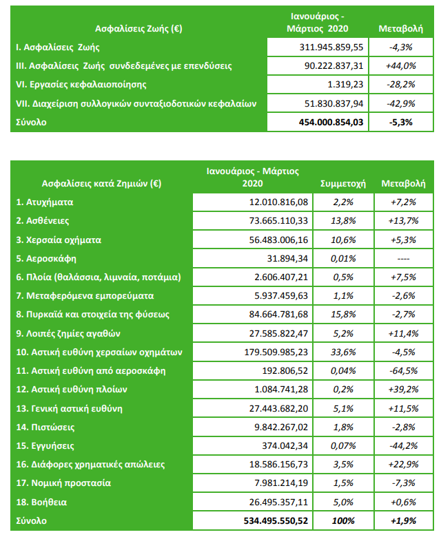 Ειδικότερα σύμφωνα με τα στοιχεία της ΕΑΕΕ οι ασφαλίσεις ζωής έφτασαν τα 454 εκατ. ευρώ και μειώθηκαν κατά 5,3%, ενώ οι ασφαλίσεις κατά ζημιών αυξήθηκαν κατά 1,9% και έφτασαν τα 534,4 εκατ. ευρώ.
