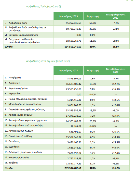 Μειωμένη κατά 0,5% είναι η παραγωγή των ασφαλιστικών εταιρειών το Γενάρη, με τη γενικότερη οικονομική συγκυρία να επηρεάζει τις ασφαλίσεις στους κλάδους ζωής, από όπου “χάνεται” το 16,9% της παραγωγής σε σχέση με την αντίστοιχη περίοδο του 2022 σε αντιδιαστολή με τις γενικές ασφαλίσεις που “κερδίζουν” επιπλέον 15,2% σε ασφάλιστρα.