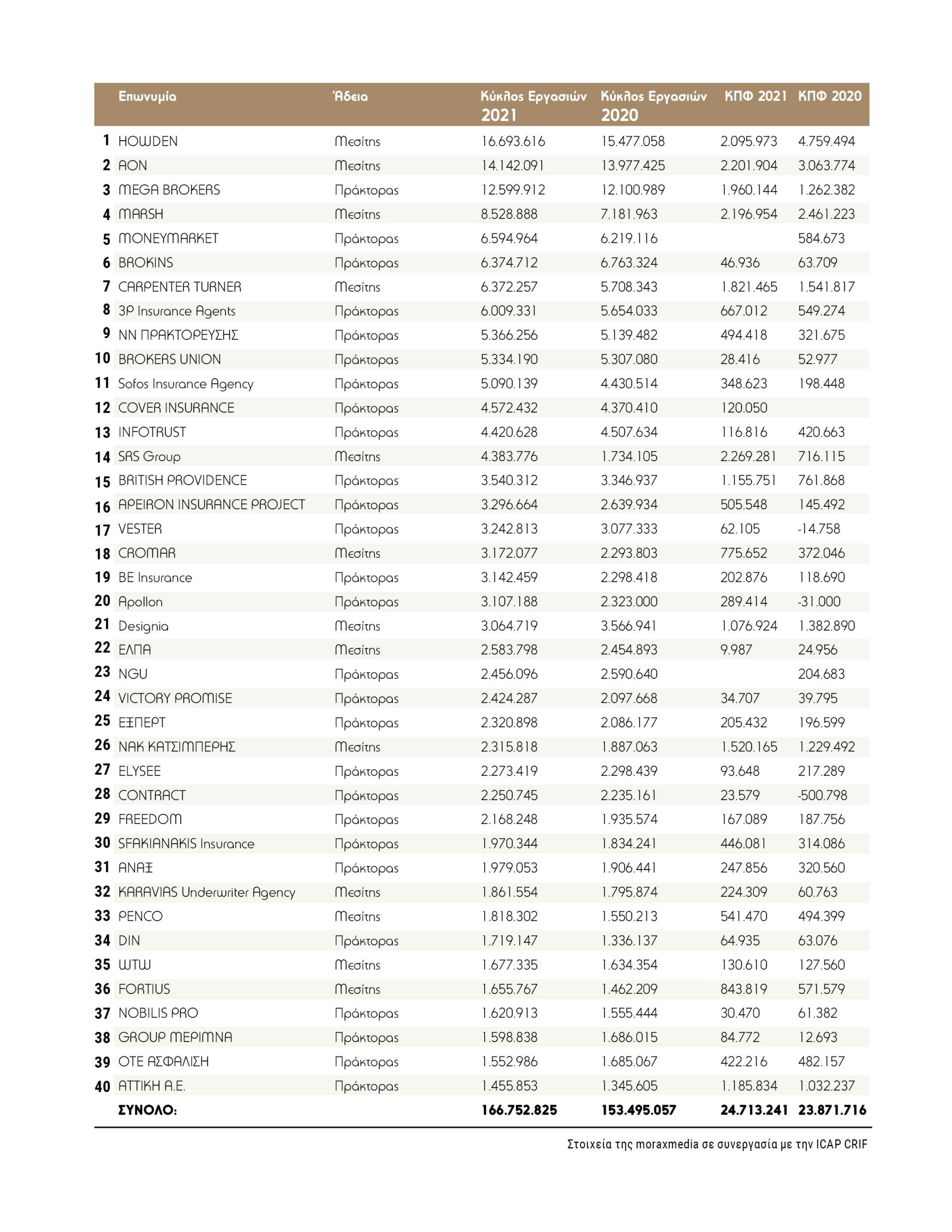 Τη φετινή λίστα των 40 μεγαλύτερων Μεσιτών & Πρακτόρων της morax media σε συνεργασία με την ICAP CRIF με στοιχεία του 2021* συμπληρώνουν 27 γραφεία με άδεια Ασφαλιστικού Πράκτορα και 13 με άδεια Μεσίτη Ασφαλειών.