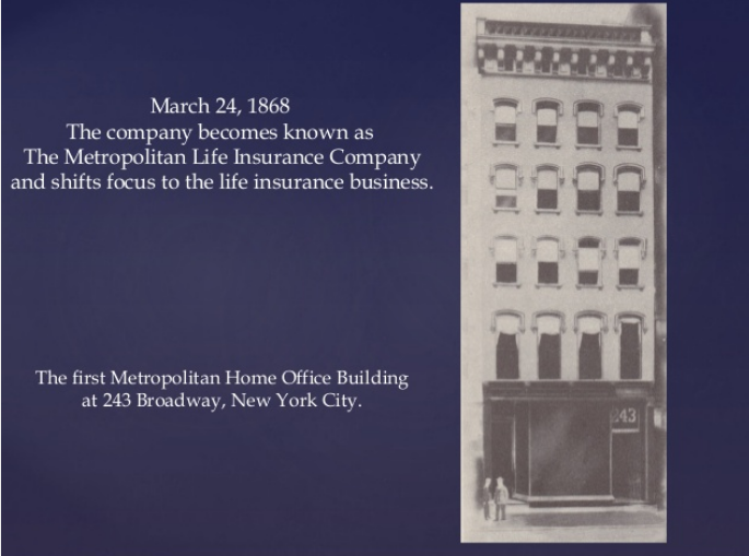 Όταν η MetLife ξεκίνησε τις εργασίες της, στις 24 Μαρτίου 1868, πούλησε μικρό αριθμό συμβολαίων, το τηλέφωνο δεν είχε ακόμη εφευρεθεί και τα ηλεκτρικά φώτα ήταν ακόμα δυσεύρετα. Ο πληθυσμός των Ηνωμένων Πολιτειών ήταν περίπου 37 εκατομμύρια και το πρώτο γραφείο της εταιρείας είχε δύο δωμάτια – αρκετό χώρο για τους έξι εργαζόμενους που απασχολούσε. Η νέα επιχείρηση αντιμετώπισε πολλές δυσκολίες. Μια σοβαρή επιχειρηματική ύφεση που ξεκίνησε στις αρχές της δεκαετίας του 1870 έθεσε γρήγορα τις μισές από τις 70 εταιρείες ασφάλισης ζωής εκτός αγοράς. Μόνο οι ισχυρές και με όραμα εταιρείες επιβίωσαν.
