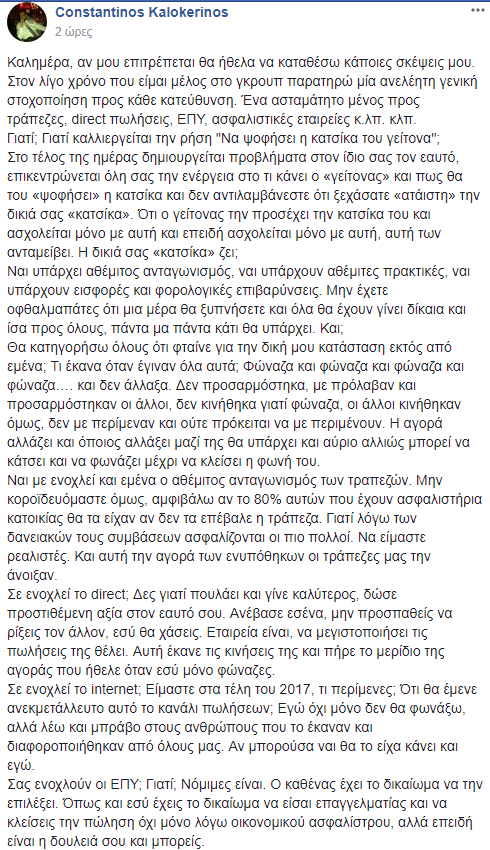 “Καλημέρα, αν μου επιτρέπεται θα ήθελα να καταθέσω κάποιες σκέψεις μου. Στο λίγο χρόνο που είμαι μέλος στο γκρουπ παρατηρώ μία ανελέητη γενική στοχοποίηση προς κάθε κατεύθυνση. Ένα ασταμάτητο μένος προς τράπεζες, direct πωλήσεις, ΕΠΥ, ασφαλιστικές εταιρείες κ.λπ. κλπ. Γιατί; Γιατί καλλιεργείται τη ρήση “Να ψοφήσει η κατσίκα του γείτονα”;