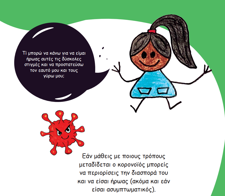 «Βλέπεις αυτό το μικρό πλασματάκι? Όσο μικρό και αθώο και να φαίνεται, είναι κακό, και καταφέρνει να κρύψει τον πραγματικό του εαυτό με μεγάλη άνεση. Είναι ένας ιός που ονομάζεται κορονοϊός, αλλά ίσως να τον ξέρεις και ως “COVID-19” ή “SARS-Cov-2”. Παρ’ όλο που είναι κακός, είναι περίπου 4.000 φορές μικρότερος από μυρμήγκι»