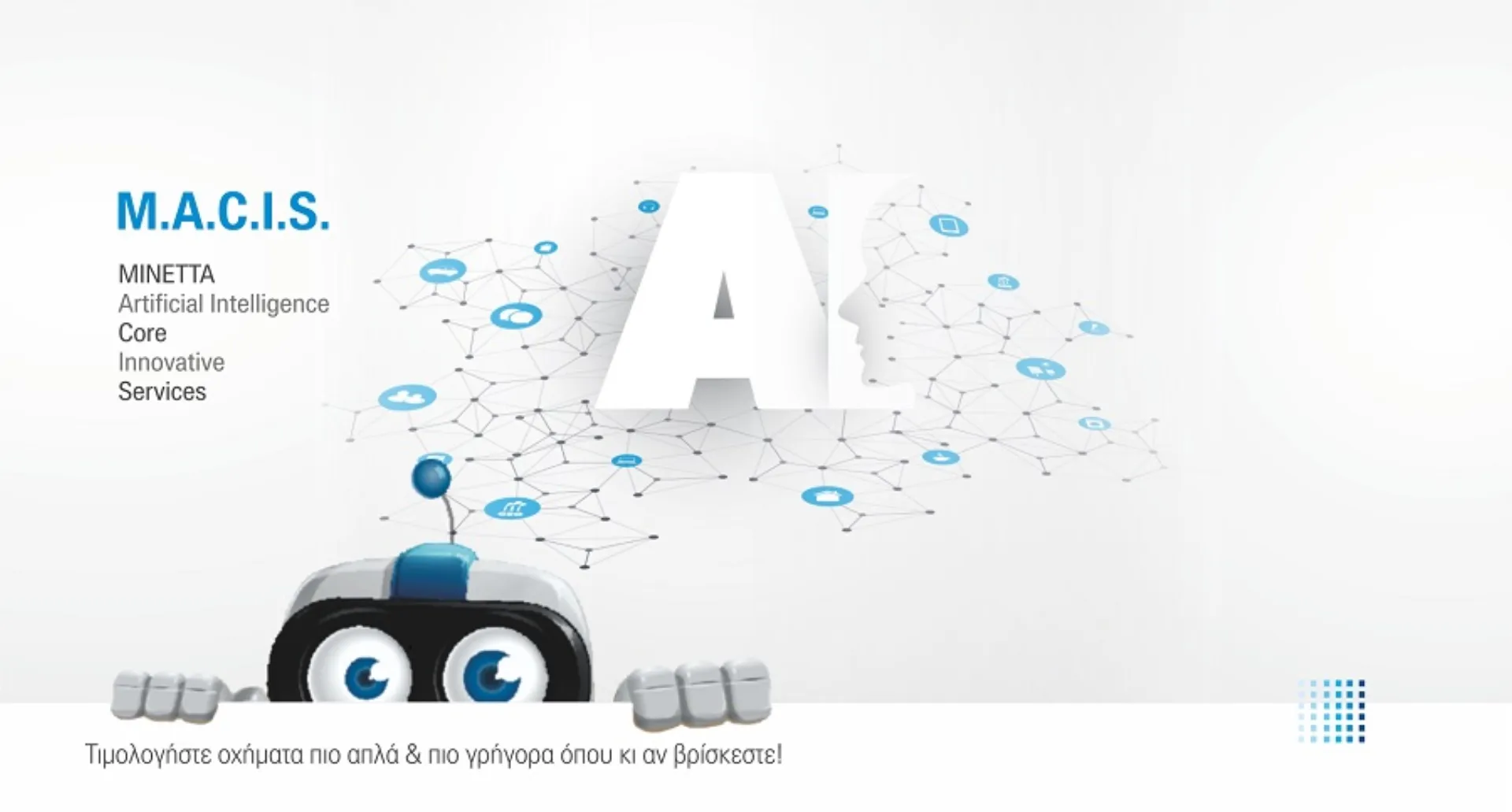 Τη νέα υπηρεσία τιμολόγησης M.A.C.I.S. (MINETTA Artificial Intelligence Core Innovative Services) στο online σύστημα της Εταιρείας διαθέτει η ΜΙΝΕΤΤΑ Ασφαλιστική στους συνεργάτες της από την αρχή του έτους.