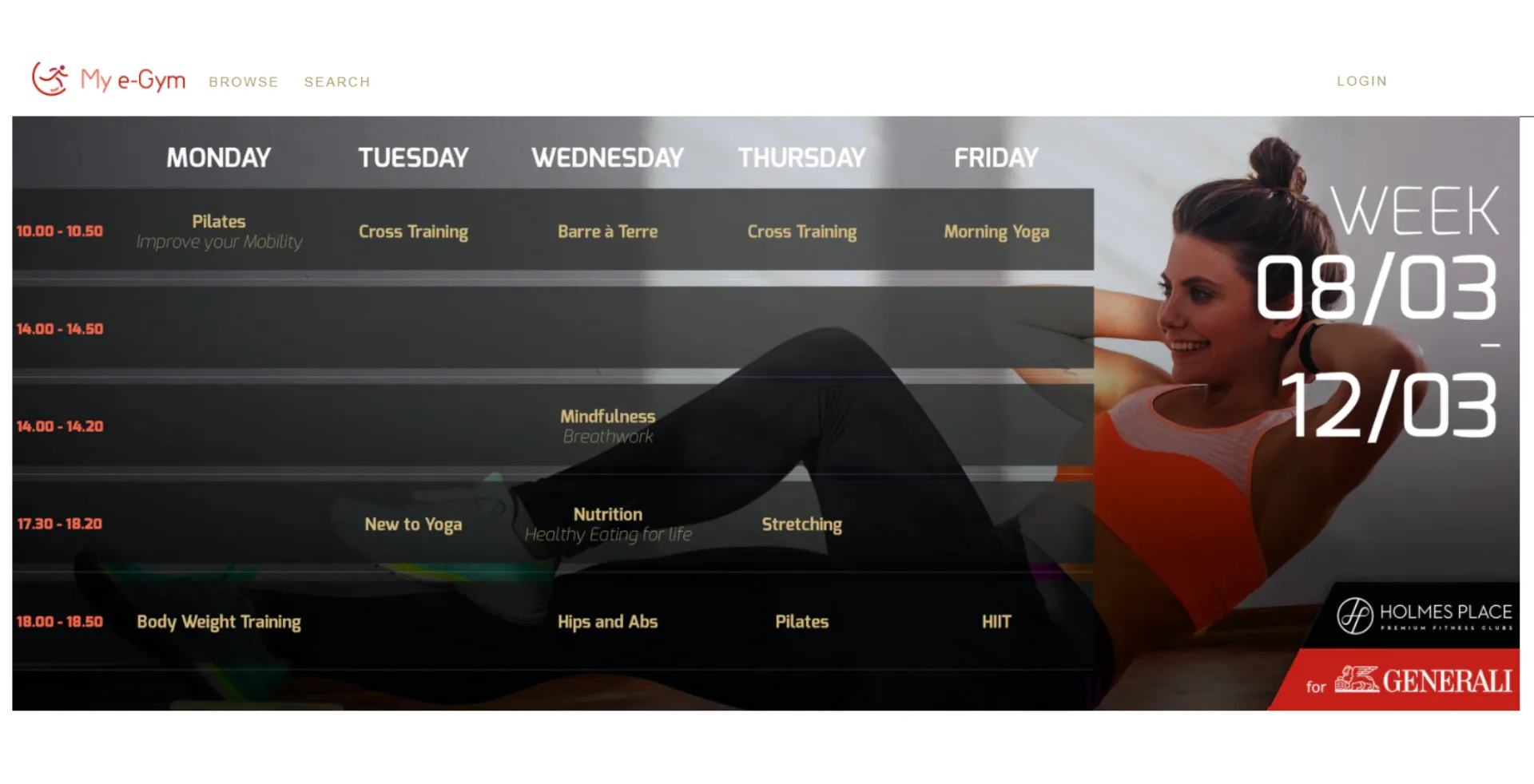 Το Mye-Gym είναι μία δωρεάν πλατφόρμα με ειδικά διαμορφωμένα προγράμματα εκγύμνασης και ευεξίας. Ο ασφαλισμένος μπορεί τώρα να γυμναστεί από το σπίτι και να γνωρίσει τα οφέλη της άσκησης στο σώμα και τη διάθεσή του, με την καθοδήγηση των κορυφαίων trainers των HolmesPlace.Live sessions γυμναστικής, προγράμματα mind fulness και έξυπνα workouts είναι τώρα προσβάσιμα μέσα από το Life On health ecosystem της Generali.