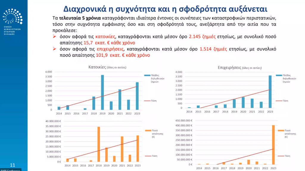 Όπως ανέφερε ο πρόεδρος της Επιτροπής Περιουσίας της ΕΑΕΕ, κ. Ε. Μοάτσος, “τα τελευταία 30 χρόνια έχουν καταγραφεί 51 σοβαρές καταστροφές που οδήγησαν σε αποζημιώσεις 968 εκατ. ευρώ. Τα ακραία φυσικά φαινόμενα πλέον είναι περισσότερα και πιο σφοδρά και αυτό αποδεικνύεται και μέσα από τις ασφαλισμένες ζημιές. Από το 1993 μέχρι το 2013 είχαμε ένα σοβαρό φυσικό φαινόμενο ανά έτος. Από το 2013 μέχρι το 2023 σημειώνονται 3 σοβαρά φαινόμενα ανά έτος.”.