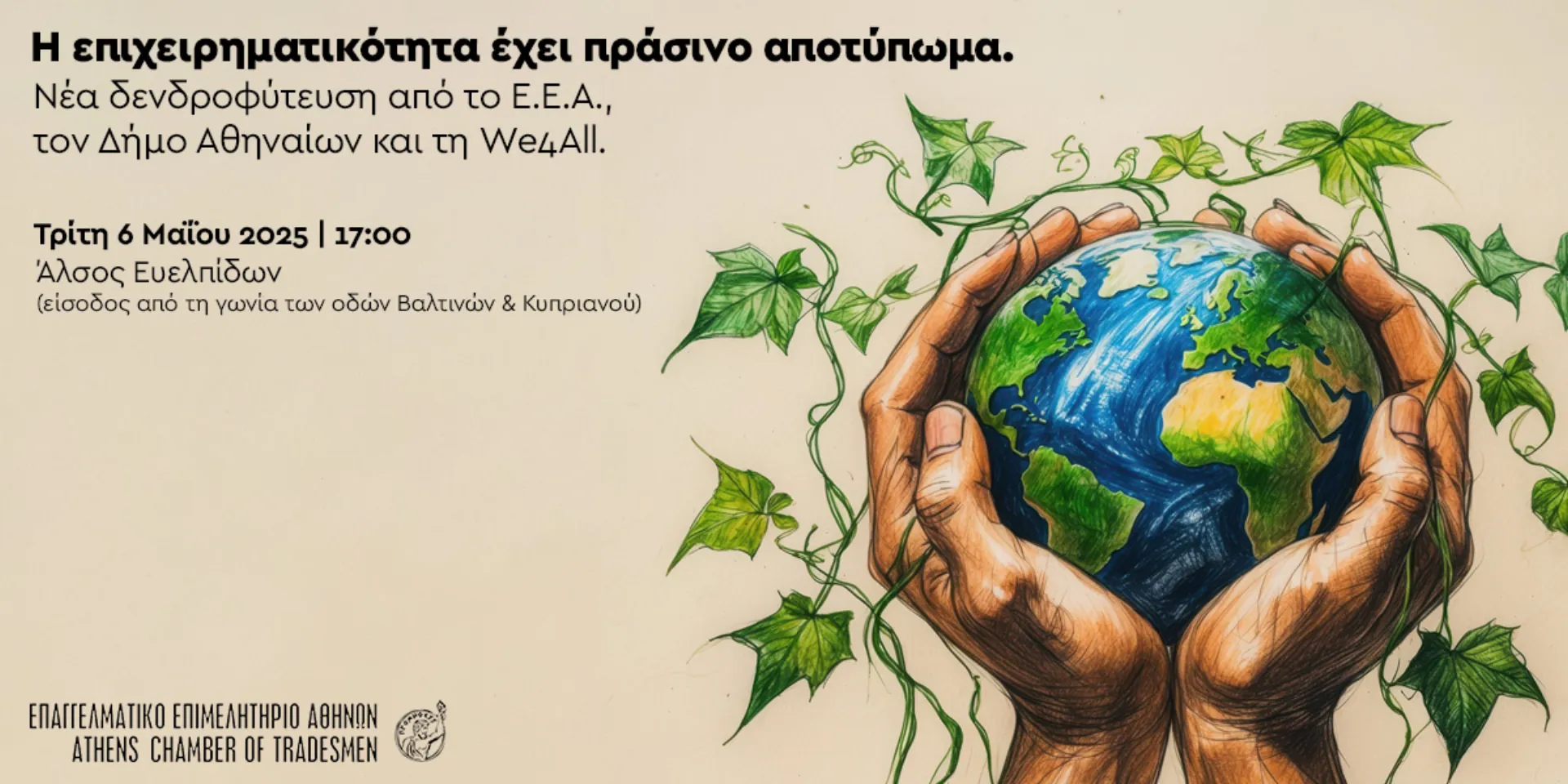 Την Τρίτη 6 Μαΐου 2025, στις 17:00 το EEA προσκαλεί επιχειρηματίες, επαγγελματίες, εργαζόμενους, οικογένειες, μαθητές, κατοίκους και εκπροσώπους της τοπικής αυτοδιοίκησης στο Άλσος Ευελπίδων, σε μια ακόμα δενδροφύτευση, που πραγματοποιείται σε συνεργασία με τον Δήμο Αθηναίων και τη WE4ALL.