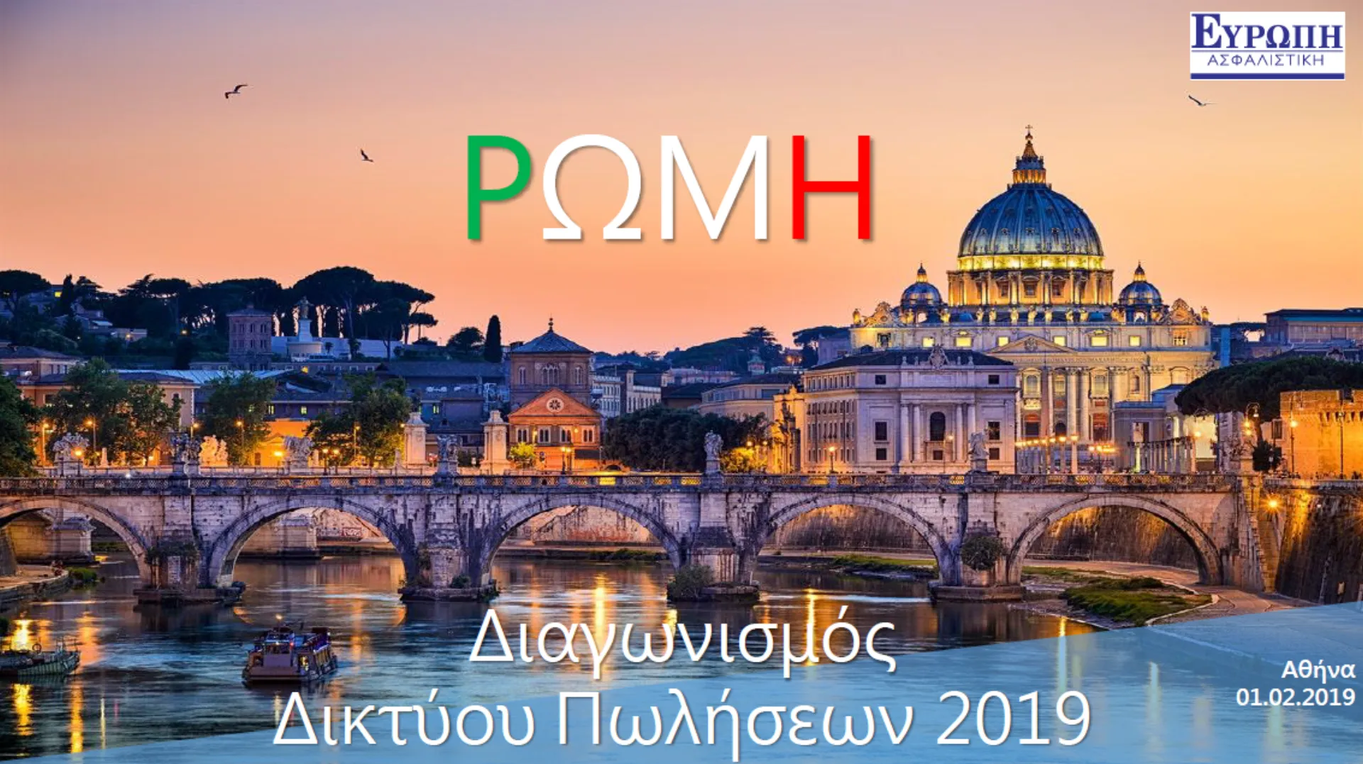 Το Νέο Διαγωνισμό Πωλήσεων με προορισμό τη ΡΩΜΗ ανακοίνωσε η ΕΥΡΩΠΗ Ασφαλιστική στο δίκτυο συνεργατών της. Η Εταιρεία φιλοδοξεί ο Διαγωνισμός αυτός να αποτελέσει ένα επιπλέον κίνητρο για τους συνεργάτες της αλλά και να δώσει την ευκαιρία για ανταλλαγή απόψεων έξω από την καθημερινή δουλειά.