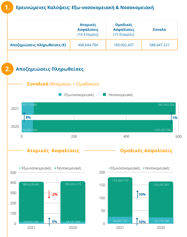 Η εμπιστοσύνη κτίζεται πάνω στην απόδοση/επιστροφή αξίας στους ασφαλισμένους. Ενθαρρυντικό δείγμα του ενδιαφέροντος των πολιτών για την κατά προτεραιότητα ασφάλιση της υγείας αποτελεί η αύξηση των ασφαλιστηρίων συμβολαίων υγείας κατά το 2021 (σύμφωνα στοιχεία της ΕΑΕΕ). Τόσο σε ατομικές ασφαλίσεις, όπου οι ασφαλισμένοι ανήλθαν σε 1.082.391 με ετήσια αύξηση 6% όσο και σε ομαδικές, όπου το σύνολο των καλυπτομένων έφθασε στους 1.273.609, αυξημένο κατά 7% σε σχέση με το 2020. Ταυτόχρονα, μειώθηκε περαιτέρω το ποσοστό ακυρωσιμότητας, στο 9% – δηλαδή, βελτιώθηκε η διατηρησιμότητα των συμβολαίων. Η απόδοση οικονομικής αξίας στους ασφαλισμένους σε αποζημιώσεις ανήλθε στα 589 εκατ. ευρώ.