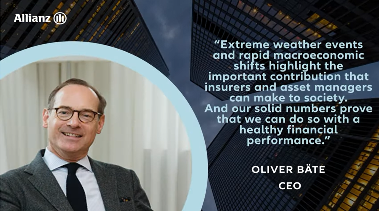 Άνοδο σε όλους τους οικονομικούς δείκτες κατέγραψε ο όμιλος της Allianz . Όπως αναφέρει ο CEO, Oliver Bate, τα ακραία φυσικά φαινόμενα και οι μακροοικονομικές μεταβολές αναδεικνύουν τη συμβολή και το ρόλο της ιδιωτικής ασφάλισης και η επίδοση του ομιλου αποδεικνύει ότι μπορεί να ανταπεξέλθει στο ρόλο του έχοντας υψηλές επιδόσεις¨.